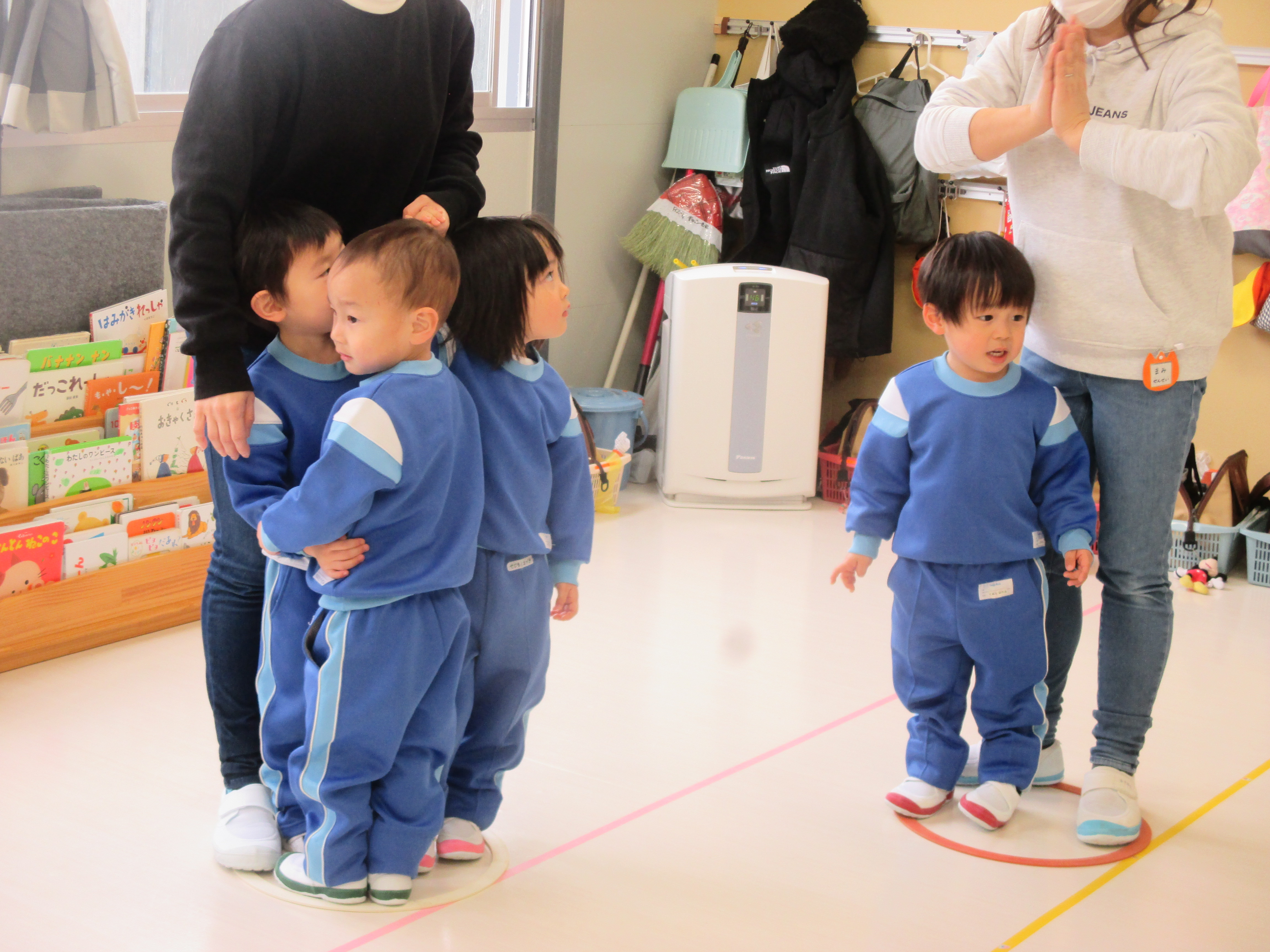 今回はラバーリングを一人にひとつずつ渡して床に置き、両足でリングの中に入ったり出たりして遊びました!(^^)!「せーのっ!」の合図でリングの中にジャンプ!!また、「せーのっ!」でリングの外にジャンプしてみましたがどの子もかけ声に合わせてとっても上手にジャンプしてくれました(*^^)vみんなの息もぴったりです!!ずいぶんとみんなでいろんなことを楽しめるようになってきて嬉しく感じます!少しずつ年少組のお兄さんお姉さんに近づいてきたようです!