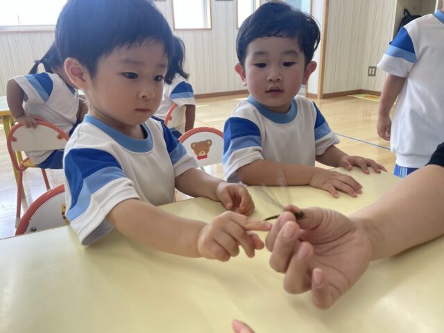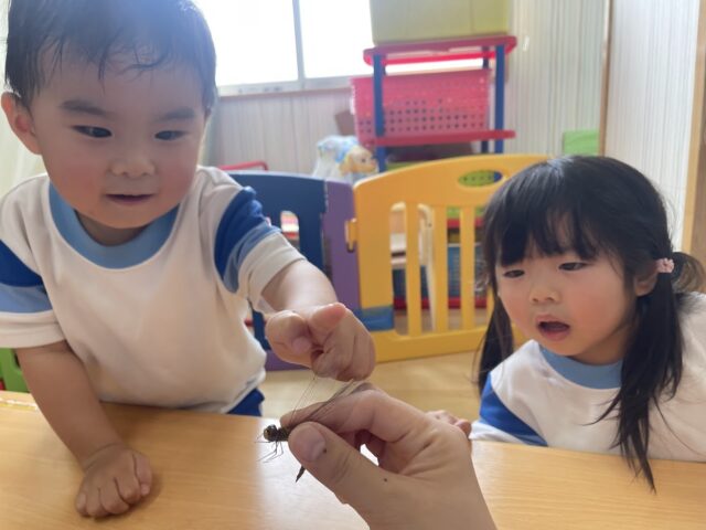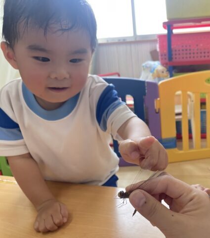 園庭にはとんぼやバッタなど様々な生き物がいて、ドキドキしながら触ってみたり観察したりしています。