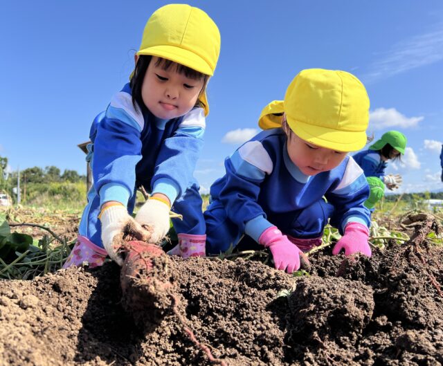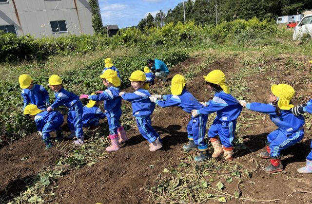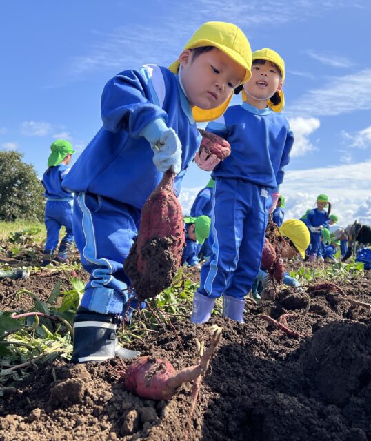 いつもと違う泥の感触に戸惑っている子もいましたが、頭が見えているお芋を掘り起こそうと頑張ったたんぽぽ組さんでした😊
