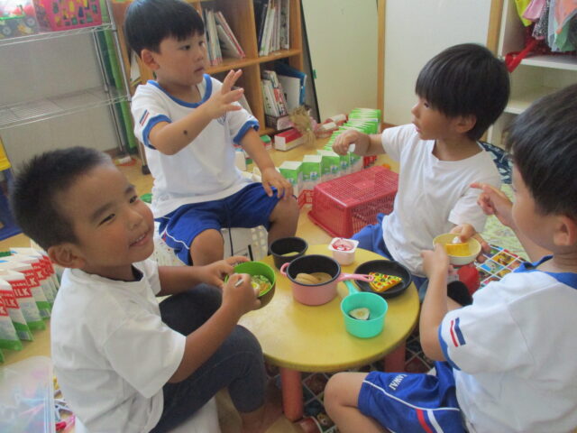 最近ではイメージを共有しながら役を決めてごっこ遊びを楽しんだり、遊びを通してやりとりが増えてきたりする姿が見られるようになってきました。その中で自然と相手の気持ちに気付いたり思いやりの気持ちが出てきたりする姿が見られ、嬉しく思います。