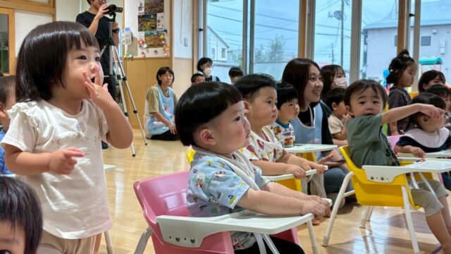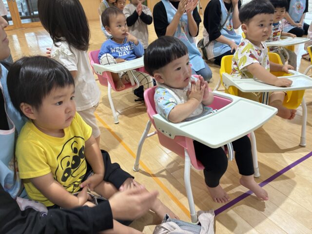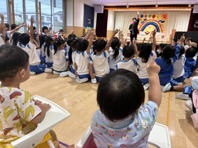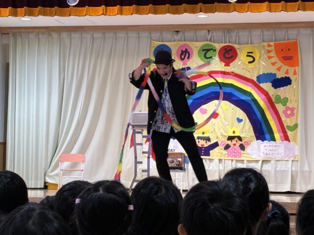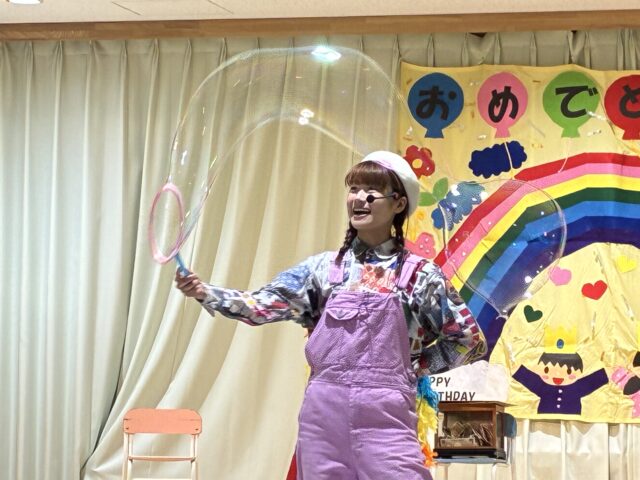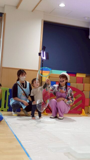 観劇に「シャボン玉のかこちゃん」と「マジシャンのひでお兄さん」が明幸幼稚園に来てくれました。とっても楽しいシャボン玉やマジックのショーに大喜びの子どもたち!マカロン組のお友だちをゲストに選んでもらい、一緒にショーに参加して大きなシャボン玉を作る体験もさせてもらいました。