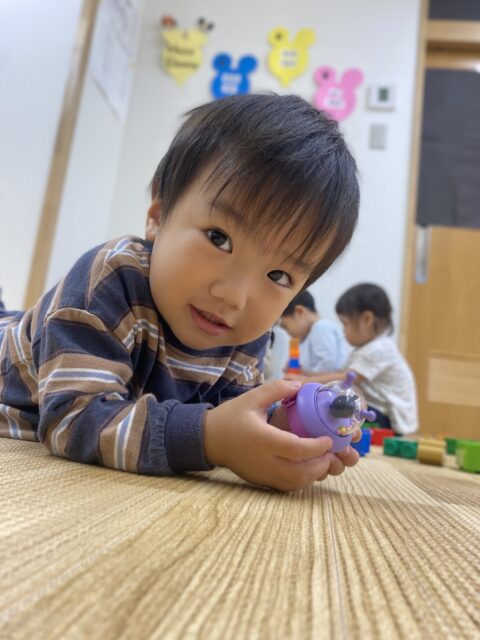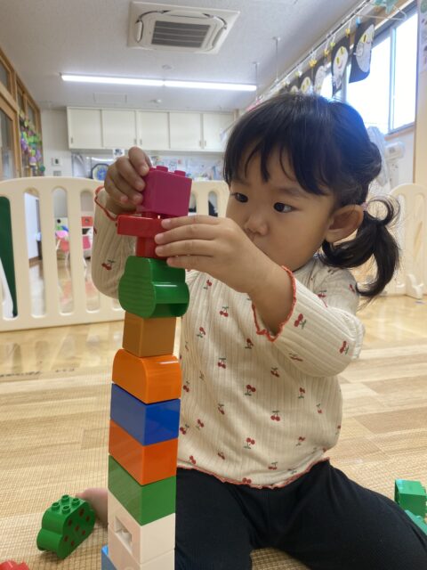 初めは組み立てる事も難しく、先生やって~と差し出すだけでしたが、崩れないようバランスを考えたり、同じような色で分けたりして遊ぶ姿が見られてすごいなぁ✨と感心させられます!😢💕