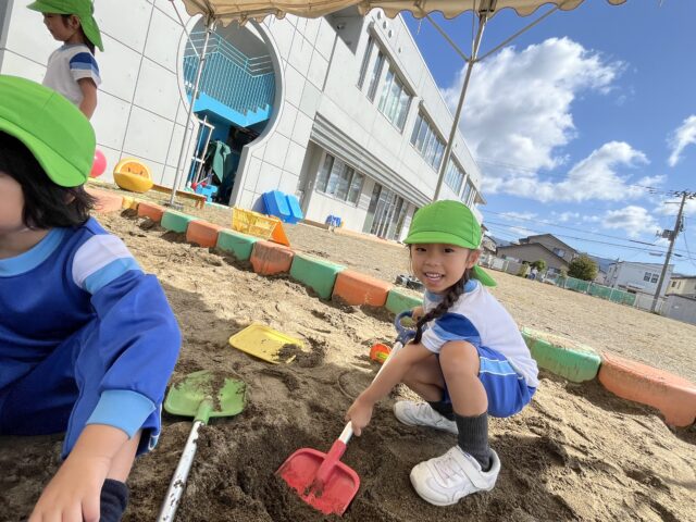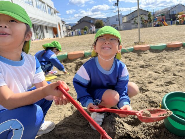 最近は砂場で穴掘りに夢中なようです。どちらのチームが深く掘ることができるか対決してみたり、山を作って貫通させて手と手を繋いだり♪いろんな楽しみ方をしていました。
