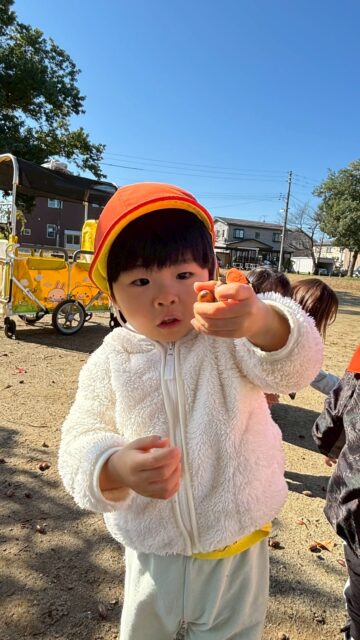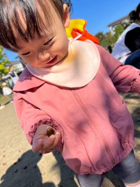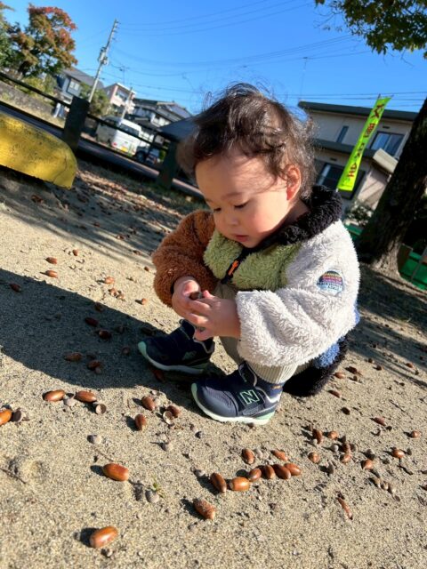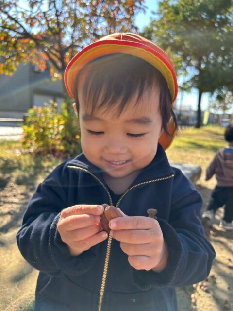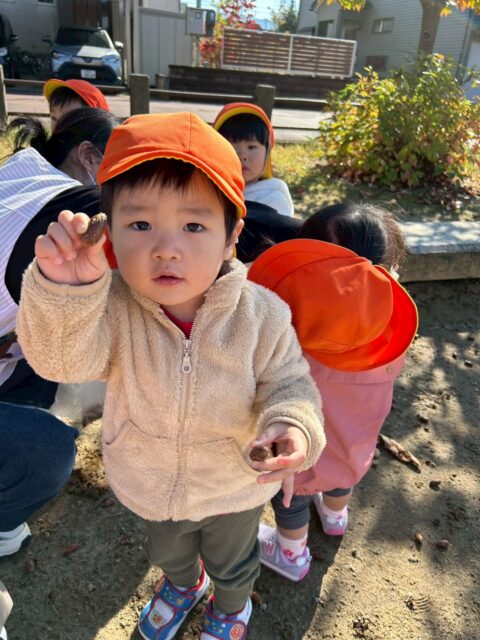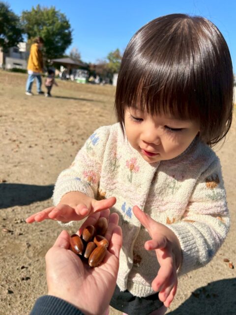 先週花園公園へ行き、みんなでどんぐり拾いを楽しんできました。木の下一面に落ちているどんぐりに始めはびっくりした様子の子どもたちでしたが、保育教諭が拾うのを見ているうちにだんだんと興味が出てきたようで、次々に拾っては嬉しそうに見せてくれました。