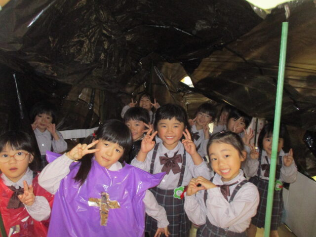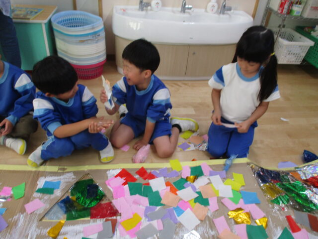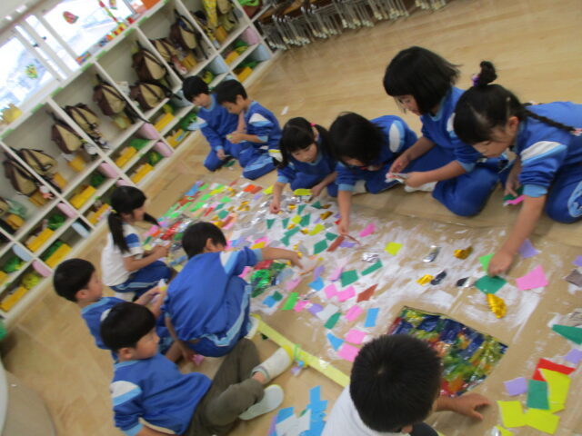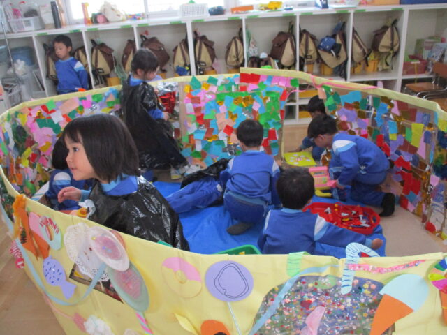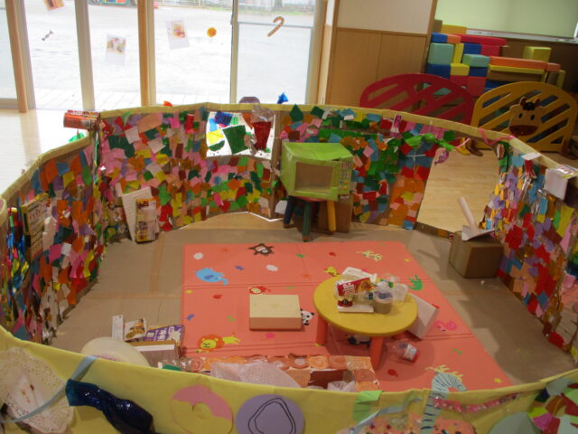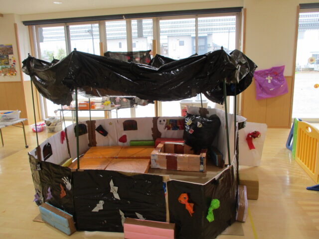 サークルタイムで「おかしのいえ」と「おばけのいえ」を作ることに決まり、試行錯誤しながら作りあげてきました。