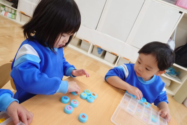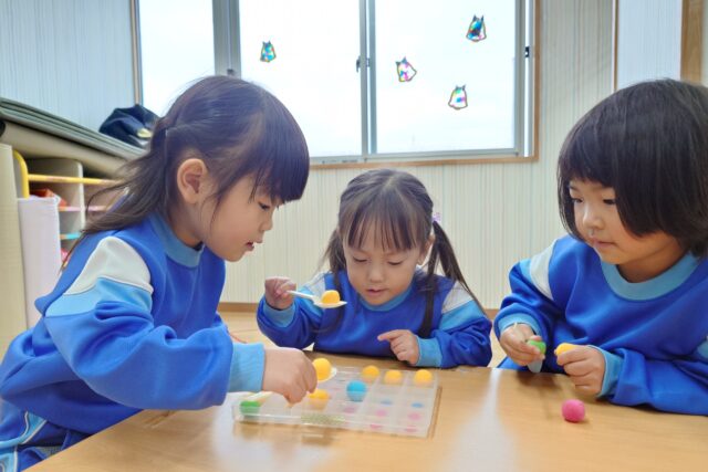 「このボールはどこにいれる?」「水色の隣にしよう!」