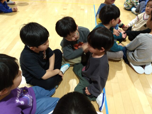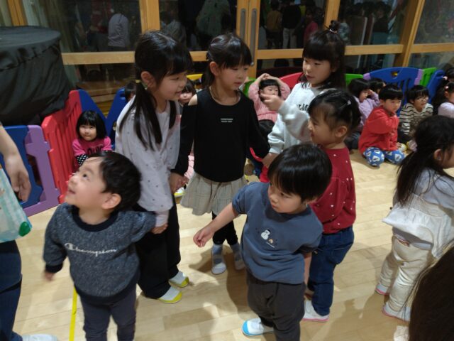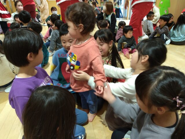 つき組 クリスマス会 2025/12/27 土曜日 最終更新日時 : 2025/12/27 土曜日 meikou 12月22日、一足早いクリスマス会。 この日はみんなが私服で登園して、うきうきしています。 今回のクリスマス会は、保育園も幼稚園も一緒に行いました。 かわいい先生サンタさんのキャンドルサービス。 ふーってして、火を消してね 「♪ジングルベル」に合わせてダンシング 未満児のお友だちと一緒に、数集まりゲーム ジ・ン・グ・ル・ベ・ル 6文字だから、6人集まろう あ~!そっちに行かないで~ サンタさんからプレゼントをもらったよ おやつには、クリスマスケーキ。 楽しい一日になりました。