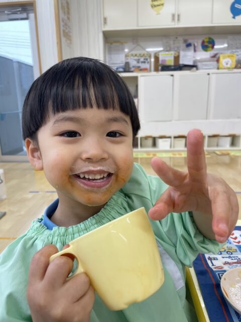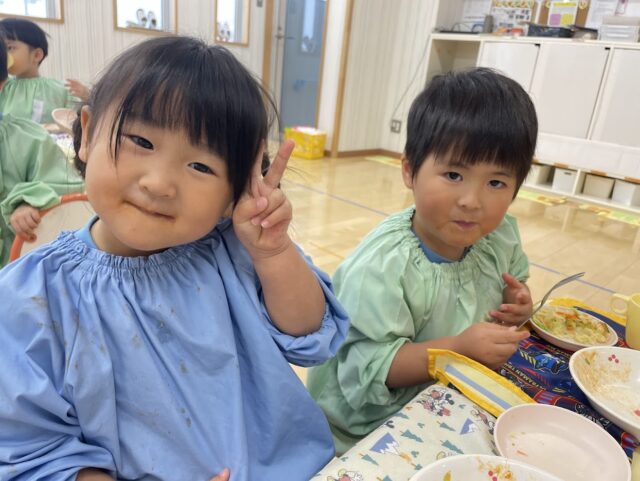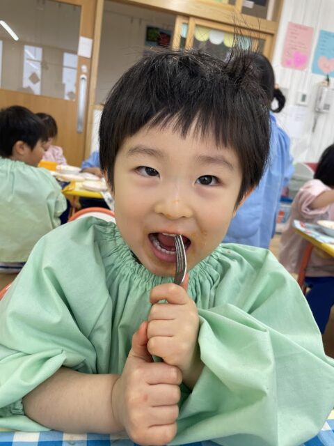 キャンディ組 ちゅるちゅるスパゲティ☆ 2026/1/23 金曜日 最終更新日時 : 2026/1/23 金曜日 meikou キャンディ組が毎日楽しみにしている時間の一つ、給食の時間! 今日の献立はミートソーススパゲティ! 「やったー!スパゲティ!」と喜ぶ声や、「グリーンピース食べられるよ!」と意気込む声がたくさん聞こえました! 「ちゅるちゅるっ☆おいしいー!」 お友だちと一緒に食べるとおいしいね! 食べ終わった子どもたちの口の周りには…? 「オレンジのおひげ!」 「牛乳を飲んだら白いおひげもできたよ!」 子どもたちのかわいらしい様子をお届けしました! これからもモリモリ食べて、大きくなぁれ!