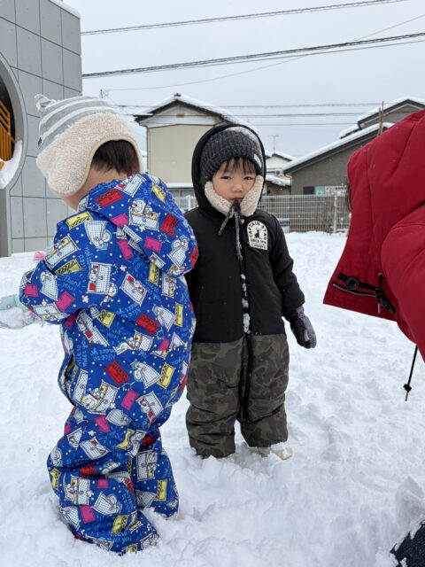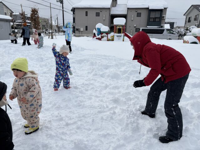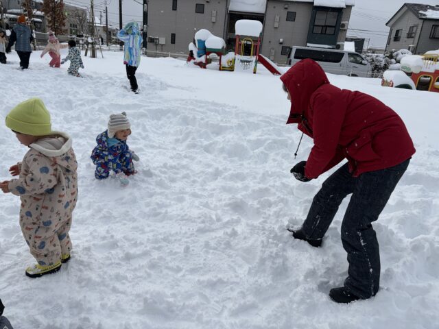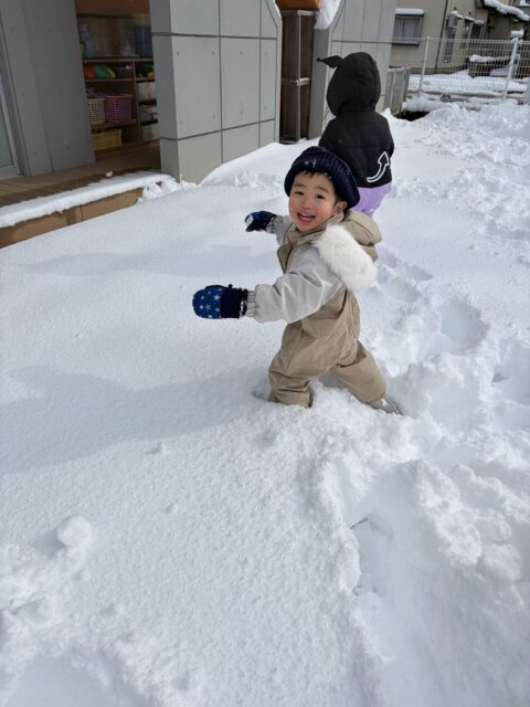 始めは思ったように動けずに立ち尽くしたり、転んで泣いたりしていましたが、先生や以上児のお兄さんたちが楽しそうにする姿を見て、少しずつ遊び込んででいました✨