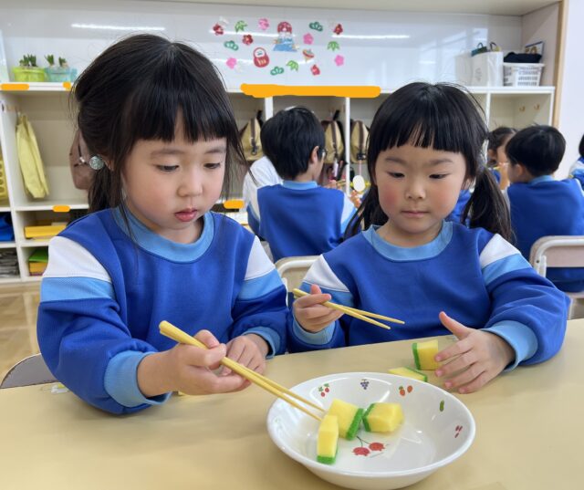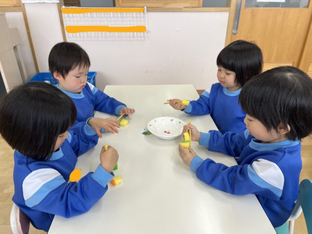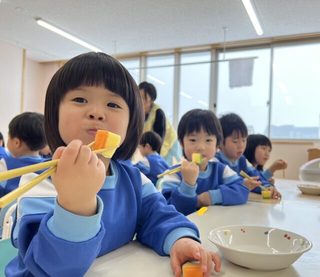 たんぽぽ組 お箸上手になったよ! 2026/1/26 月曜日 最終更新日時 : 2026/1/26 月曜日 meikou 今月の食育は“お箸の持ち方”でした!! せな先生のお話を真剣に聞きました✨ お皿に入っているスポンジをつかみます😊 「みてー!できたよー!」 真剣な表情で挑戦しています😊 「もぐもぐ♡」と食べる真似をしていた子どもたちでした😊 お箸がまだ苦手な子も何度も何度も挑戦してできるようになり嬉しそうに笑顔を見せてくれました😊 「お家で○○(キャラクター)のお箸使ってるよ!」と教えてくれたり、箸を使って給食を食べる子が増えて意欲が高まっているように感じています!
