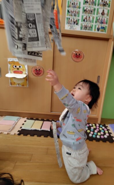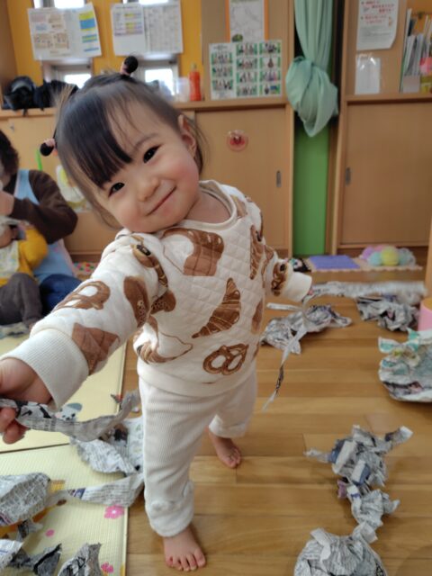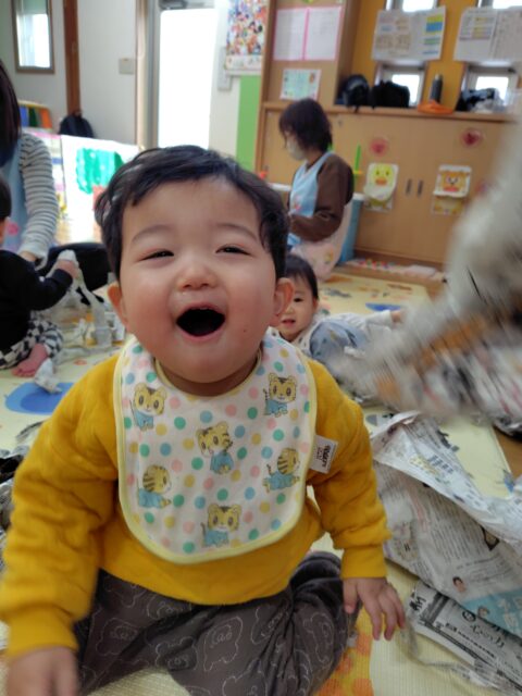 プリン組 新聞紙あそび 2026/1/30 金曜日 最終更新日時 : 2026/1/30 金曜日 meikou おゆうぎ会の小道具作りから新聞紙に興味が出てきたプリンキッズ 自分で持ってバサバサ音を立てたり ちぎったり、かぶったり、丸めたり、走ったりと それぞれの楽しみ方をしていました。 はい どうぞ! とれるかな~ 雪の女王よ あはははははっ 笑いが止まらないぞ まてまてまて~