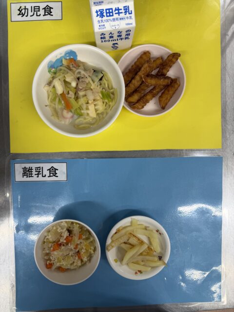 2月25日(水)今日の献立 2026/2/25 水曜日 最終更新日時 : 2026/2/25 水曜日 meikou 〈幼児食〉 長崎ちゃんぽん風 フライドポテト ミニ牛乳 〈離乳食〉 野菜うどん フライドポテト風