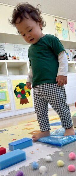 雨の日でもお部屋で体を動かしながら感触遊びも楽しめるように、センサリーマットを作りました。普段、裸足…